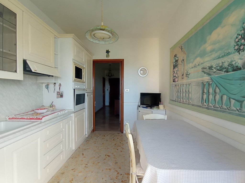 E’ un appartamento di ampia metratura, luminoso e con doppia esposizione. Dal balcone della zona giorno, interamente rivolto a Sud, si può anche godere di un piacevole scorcio di vista mare. Le condizioni interne sono molto buone, con portoncino blindato, infissi in alluminio con doppi vetri e tapparelle elettriche sia in sala che in cucina. L’impianto di riscaldamento è centralizzato con termovalvole e la produzione di acqua calda saniraria viene gestita in maniera autonoma mediante un boiler elettrico. L’immobile si trova al 4° ed ultimo piano di una palazzina in ottime condizioni, servita da ascensore e situata in una zona centrale, con ampie possibilità di parcheggio nelle immediate vicinanze e a pochi passi dal lungomare. (Rif.A907)